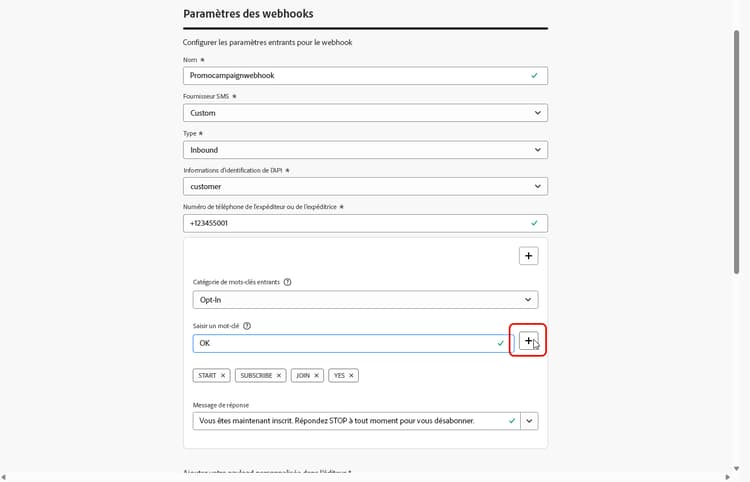 - Opt-in : SUBSCRIBE (s’abonner), YES (oui), UNSTOP (redémarrer), START (démarrer), CONTINUE (continuer), RESUME (reprendre), BEGIN (commencer).
