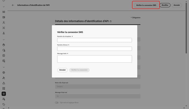 Cliquez sur Vérifier la connexion SMS, à partir de vos informations d’identification d’API existantes, pour tester et vérifier vos informations d’identification d’API SMS en envoyant un exemple de message à un appareil désigné.