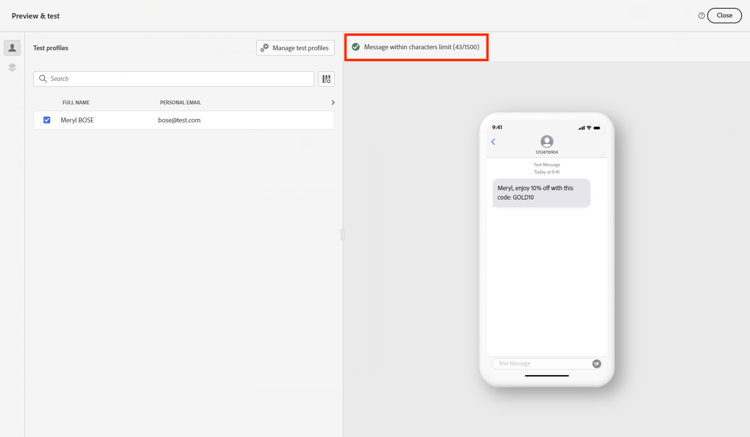 Pour ce faire, cliquez sur Simuler du contenu, puis vérifiez votre message à l’aide des données de profil de test.