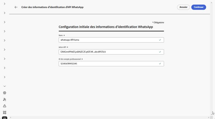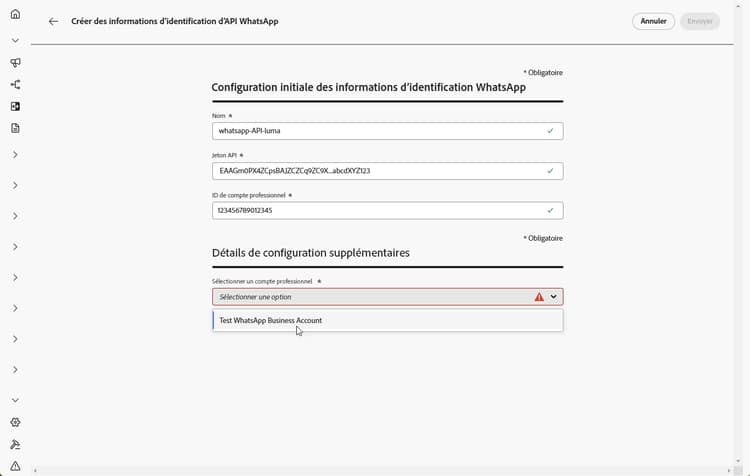 Avant d’envoyer un message WhatsApp, vous devez configurer votre environnement Adobe Journey Optimizer et l’associer à votre compte WhatsApp. Pour ce faire, procédez comme suit :
