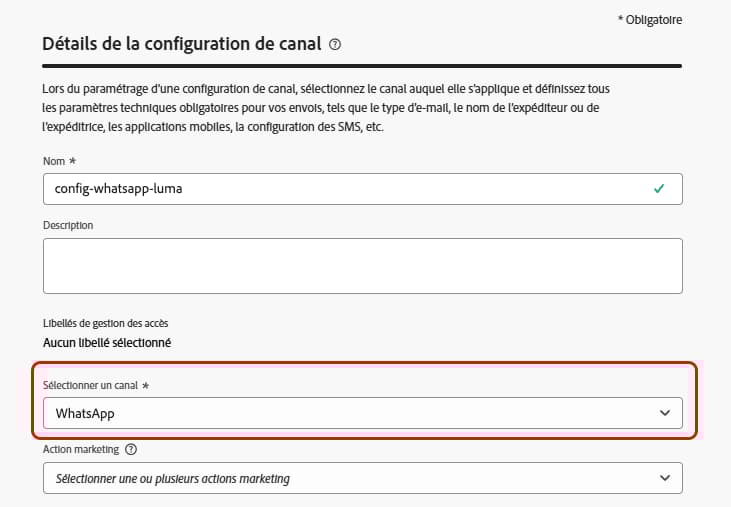 Saisissez un nom et une description (facultatif) pour la configuration, puis sélectionnez le canal WhatsApp.
