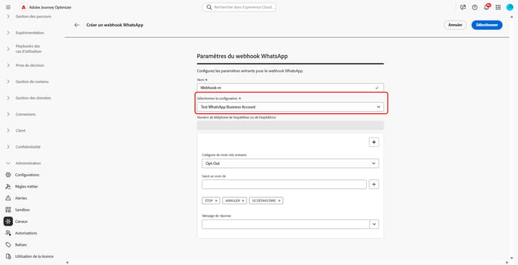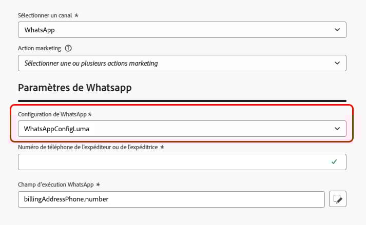 Dans la section Paramètres de WhatsApp, sélectionnez la configuration de WhatsApp précédemment créée.
