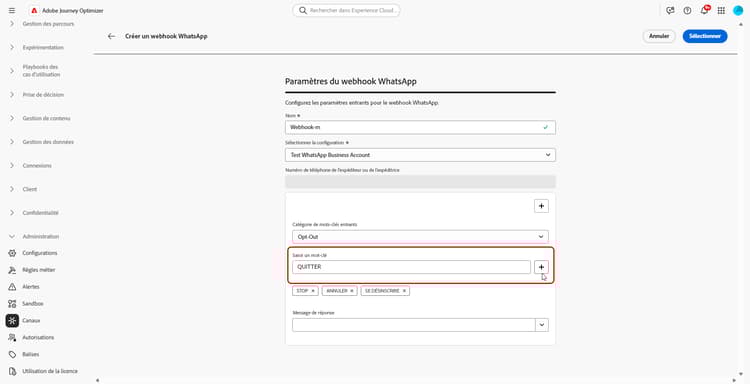 Maintenant que votre Webhook est configuré, vous pouvez créer votre configuration WhatsApp.