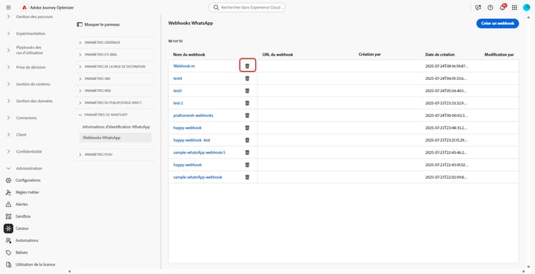 >Canaux, sélectionnez le menu Webhooks WhatsApp dans Paramètres WhatsApp, puis cliquez sur le bouton Créer un webhook.