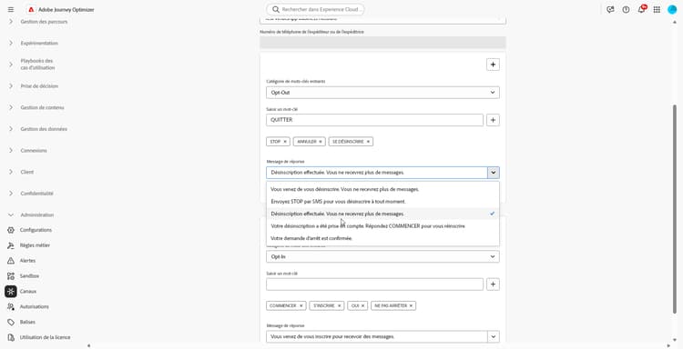 Dans le champ Message de réponse, saisissez le message envoyé lors de la réception d’un mot-clé configuré ou sélectionnez une option prédéfinie dans le menu déroulant.