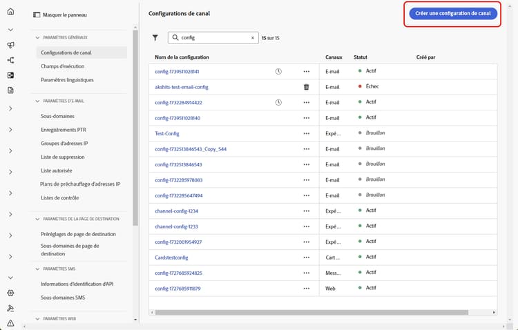 Dans le rail de gauche, accédez à Administration > Canaux et sélectionnez Paramètres généraux > Configurations de canal. Cliquez sur le bouton Créer une configuration de canal.
