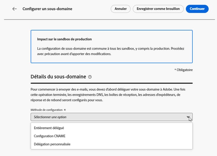Au lieu des méthodes Délégation complète et Configuration CNAME, la méthode Délégation personnalisée vous permet d’obtenir la propriété de vos sous-domaines dans Journey Optimizer et de disposer d’un contrôle total sur les certificats générés.