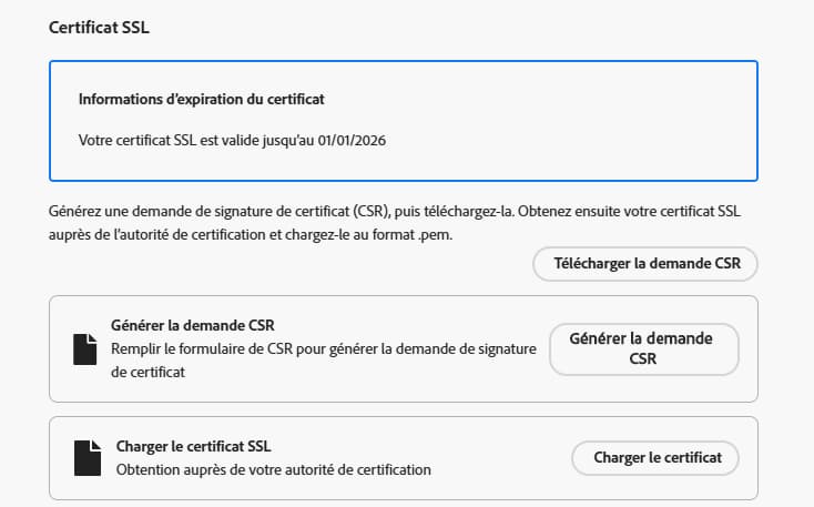 note note NOTE La date d’expiration de votre certificat SSL s’affiche. Une fois cette date atteinte, vous devrez charger un nouveau certificat. -