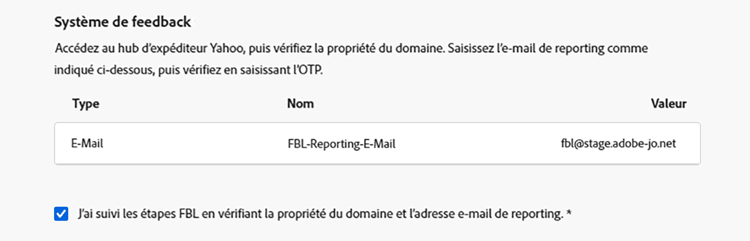 Pour vérifier la propriété du domaine, Yahoo! Sender Hub vous demandera de fournir une adresse e-mail. Saisissez l’adresse e-mail de signalement FBL indiquée sous Valeur. Il s’agit d’une adresse e-mail appartenant à Adobe.