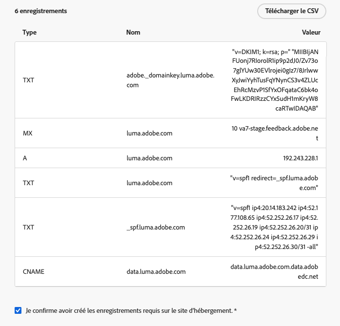 La liste des enregistrements à placer dans vos serveurs DNS s’affiche. Copiez ces enregistrements un par un ou en téléchargeant un fichier CSV.