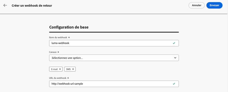 - Canaux : sélectionnez le ou les canaux pour lesquels ce webhook doit recevoir des commentaires (e-mail et/ou SMS).