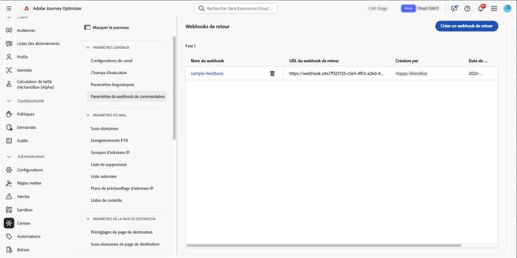 Une fois le webhook de commentaires créé, vous pouvez l’activer lors de la configuration d’une audience de campagne transactionnelle déclenchée par API. Pour en savoir plus, consultez la section Activer des webhooks.