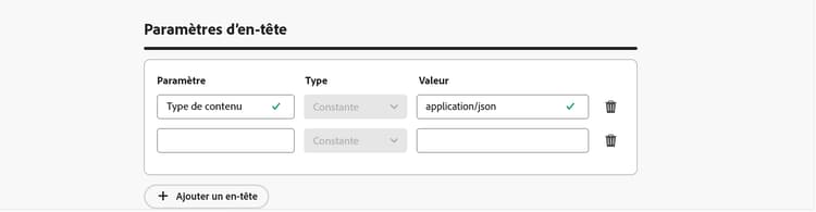 Dans la section Paramètres d’en-tête, vous pouvez configurer des en-têtes personnalisés supplémentaires à envoyer avec chaque demande de webhook.