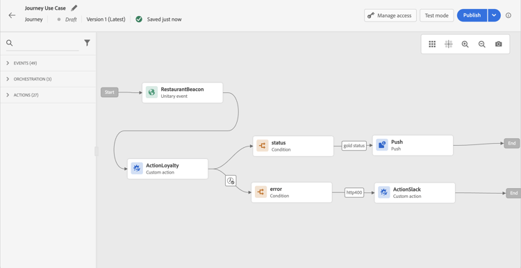 Par exemple, vous pouvez ajouter une condition pour vérifier le nombre de points de fidélité. Lorsque la personne entre dans le restaurant, votre point d’entrée local envoie un appel avec les informations de fidélité du profil. Vous pouvez envoyer une notification push si le profil est un client Gold. Et si une erreur est détectée dans l’appel, envoyez une action personnalisée pour en informer l’administrateur ou l’administratrice système.