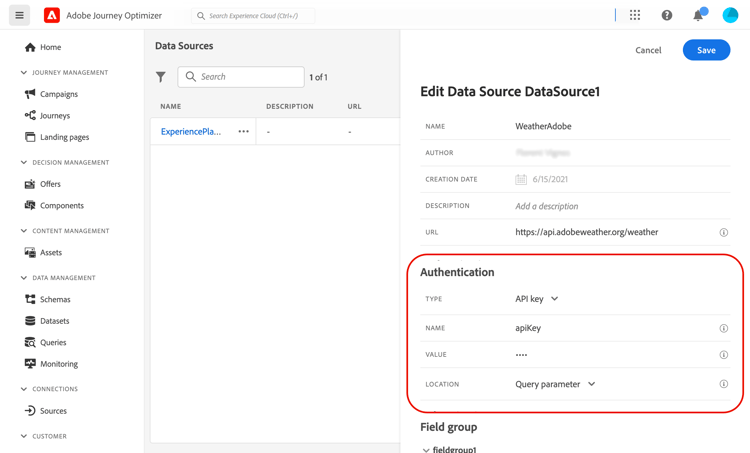 cacheDuration de Journey Optimizer en particulier an cas de lourdes charges de travail, afin d’éviter les décalages d’expiration et les erreurs 401.Création et configuration d’une source de données externe create-ext-data-sources