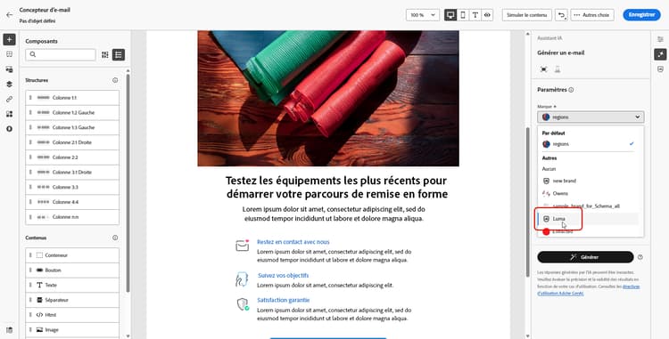 Vous pouvez désigner une marque par défaut qui sera appliquée automatiquement lors de la génération du contenu et du calcul des scores d’alignement pendant la création des campagnes.