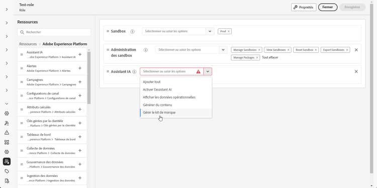 Notez que l’autorisation Activer l’Assistant IA permet uniquement d’accéder en lecture seule au menu Marques.