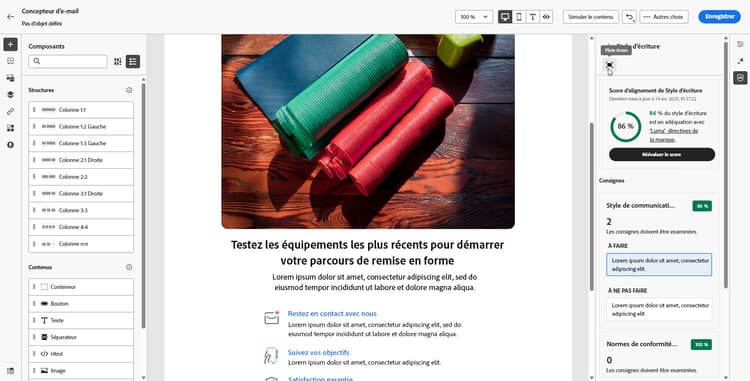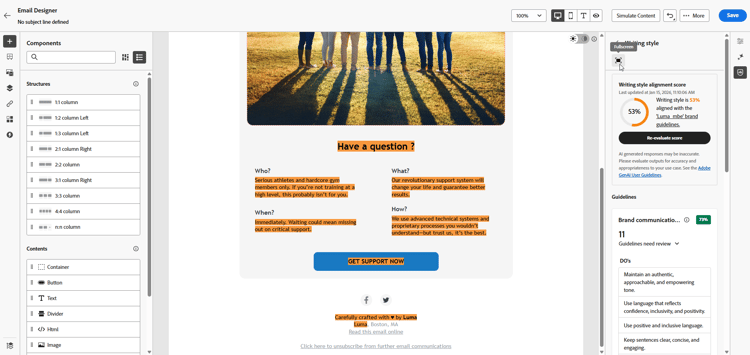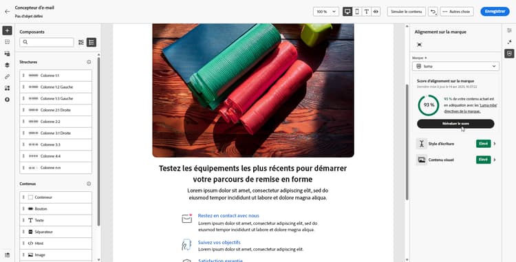 Une fois votre marque configurée et publiée, évaluez son score d’alignement directement dans votre campagne par e-mail pour vous assurer que votre contenu correspond à vos directives de marque :