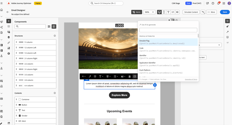 - Modification de texte en ligne dans Email Designer : directement à partir de la fenêtre contextuelle de modification en ligne lors de la modification d’un composant de texte. Voir Générer à partir du Designer d’e-mail.