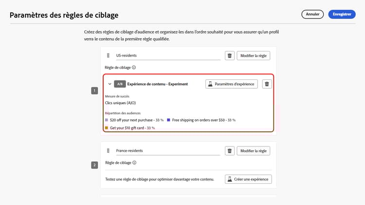Une fois l’expérience définie, elle s’applique uniquement à la première règle de ciblage.