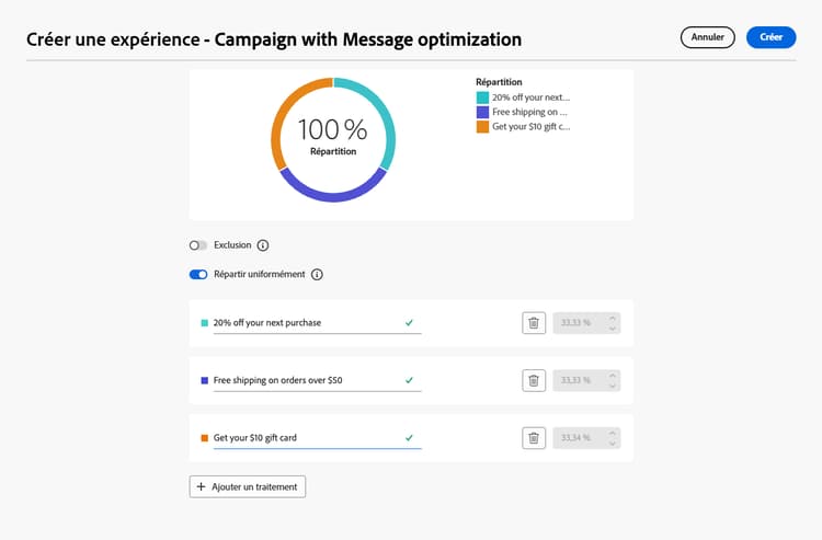 Pour configurer l’expérimentation et déterminer le message qui génère le plus d’achats, procédez comme suit.