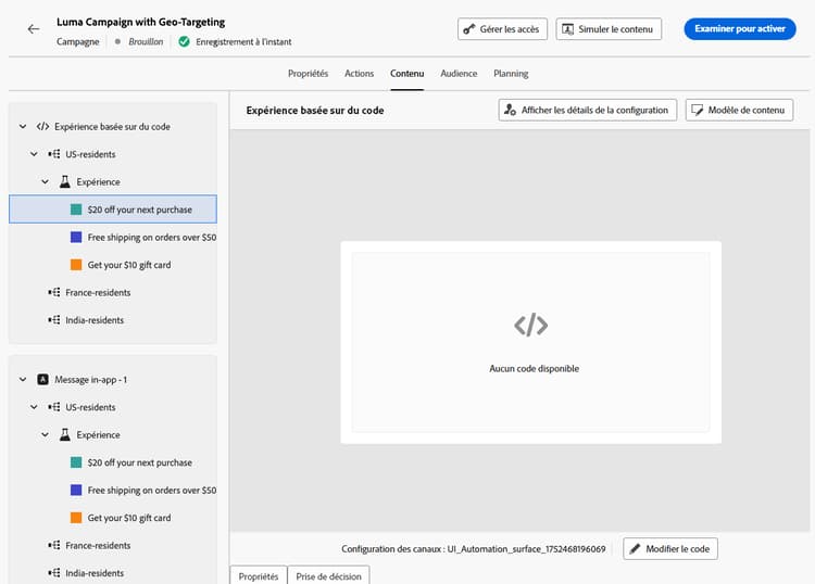 Une fois l’expérience définie, elle s’applique à toutes les actions insérées dans la campagne ou par le biais de l’activité Action du parcours, ce qui signifie que les mêmes clients et clientes voient les mêmes offres sur l’ensemble des surfaces.