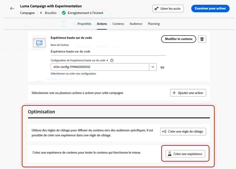 note note NOTE Vous pouvez sélectionner d’autres actions : l’expérimentation s’applique à toutes les actions ajoutées à la campagne ou au parcours. -