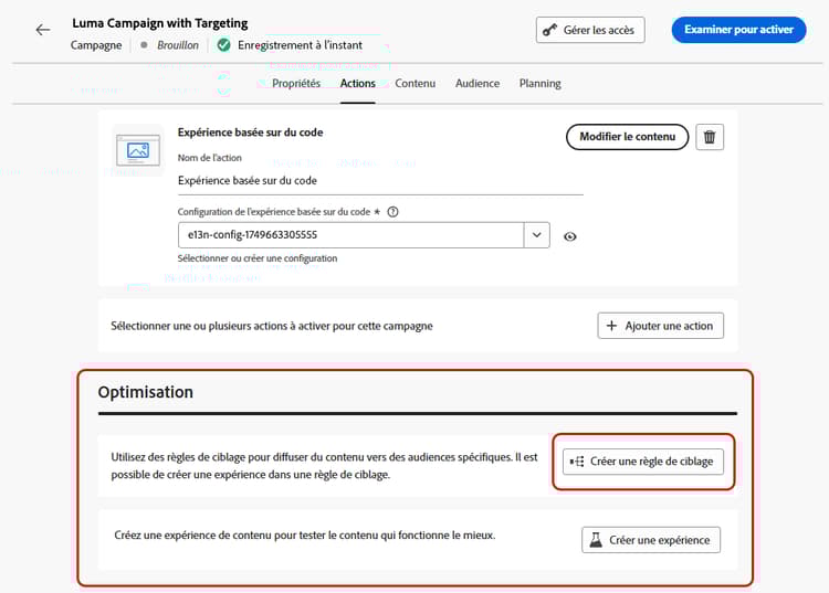 Dans la section Optimisation, sélectionnez Créer une règle de ciblage.