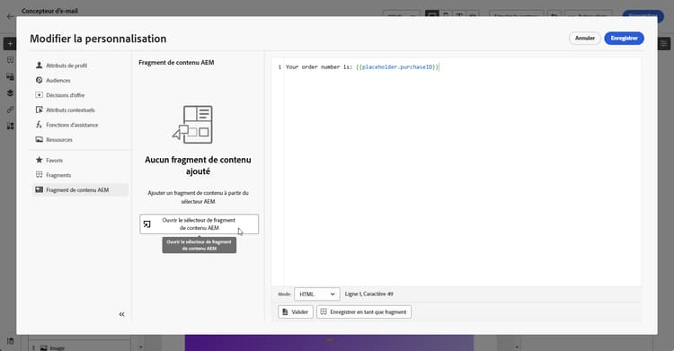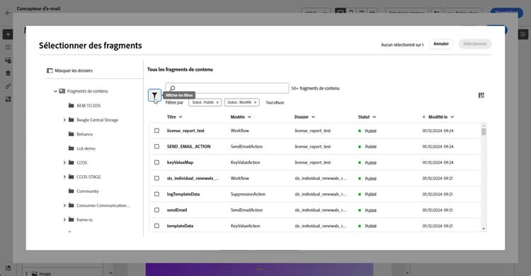 Accès : Journey Optimizer récupère et affiche les fragments de contenu disponibles à partir de l’instance de publication Adobe Experience Manager en temps réel.