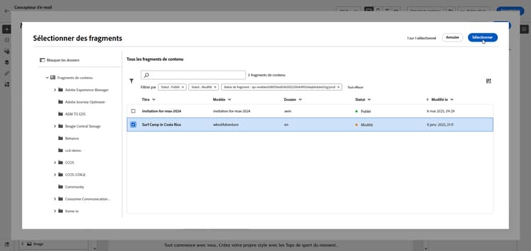 Après avoir sélectionné votre fragment de contenu, cliquez sur Sélectionner pour l’ajouter.
