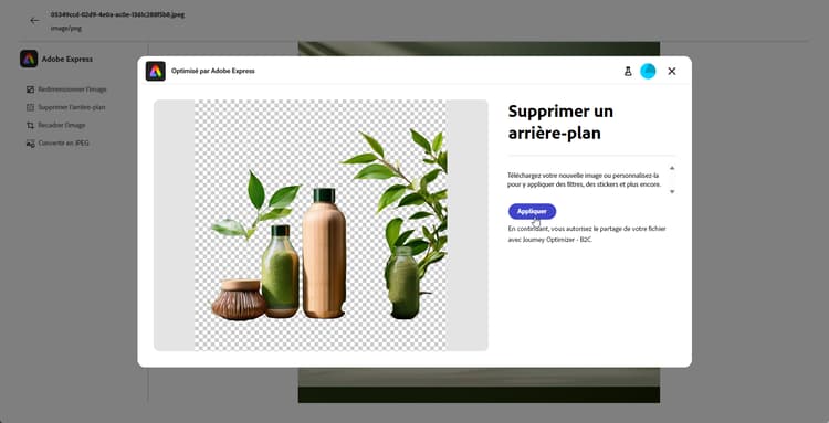 L’intégration d’Adobe Express à Adobe Journey Optimizer vous permet d’accéder facilement aux puissants outils d’édition d’Adobe Express lors de la création de contenu. Cette intégration vous permet de redimensionner des images, de supprimer des arrière-plans, de recadrer des visuels et de convertir des ressources en JPEG ou en PNG sans avoir à basculer entre les solutions.