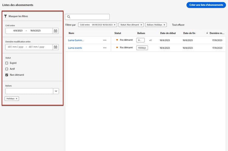 La liste reprend toutes les listes dʼabonnements créées. Vous pouvez les filtrer en fonction de leur date de création ou de modification et de leur statut.