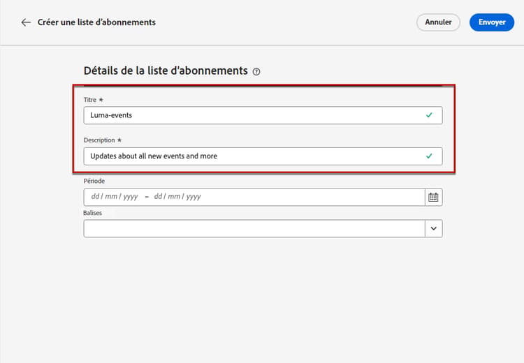note caution CAUTION Actuellement, vous ne pouvez pas utiliser d’espacement ou saisir un nom qui existe déjà pour une autre liste d’abonnements dans le champ Titre. -