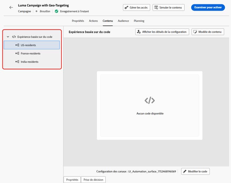 Une fois la campagne ou le parcours actif, le contenu adapté à chaque cible est envoyé : les personnes vivant aux États-Unis reçoivent un message spécifique, les personnes vivant en France un message différent, et ainsi de suite.