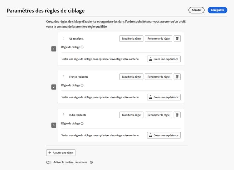 Par exemple, définissez une règle pour les personnes vivant aux États-Unis, une règle pour les personnes vivant en France et une règle pour les personnes vivant en Inde.