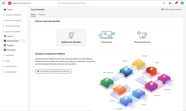 L’ajout de données à Adobe Experience Platform est la base de la création d’un profil. Vous pouvez ensuite exploiter les profils dans Adobe Journey Optimizer. Commencez par définir des schémas, utilisez les outils ETL pour préparer et normaliser vos données, puis créez des jeux de données basés sur vos schémas.