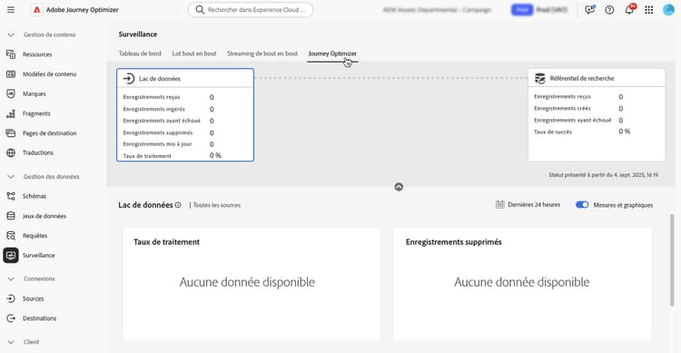 Une fois qu’un jeu de données a été activé pour la recherche, vous pouvez consulter le statut de l’ingestion dans le service de recherche en accédant au menu Surveillance et en sélectionnant l’onglet Journey Optimizer.