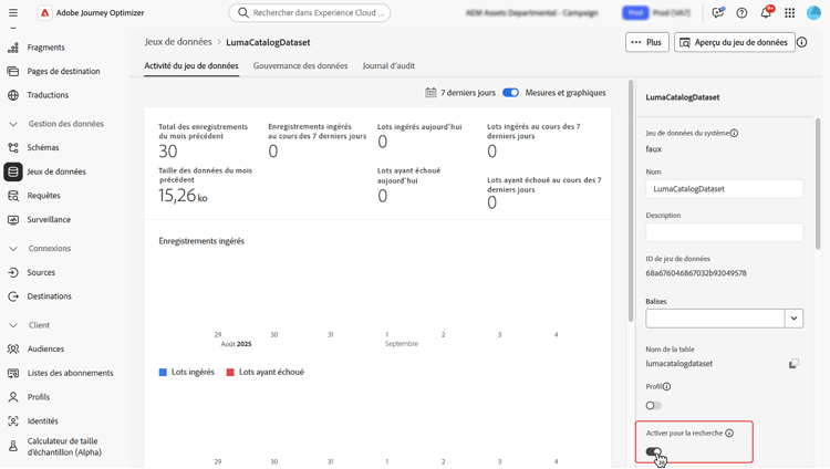 Pour utiliser les données d’un jeu de données à des fins de personnalisation, vous devez l’activer pour la recherche.