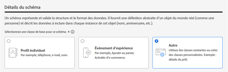 Type de schéma : les jeux de données doivent être associés à un schéma qui n’est PAS de type Profil ou Événement.