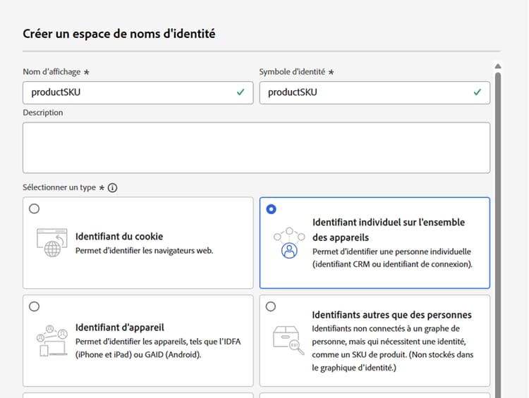 Si aucun espace de noms personnalisé n’a été défini, assurez-vous que l’identité est un identifiant qui ne concerne pas une personne.