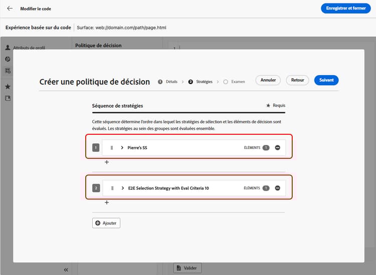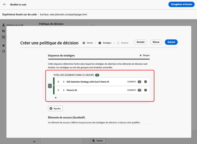 Stratégie de sélection : les stratégies de décision tirent parti des collections associées aux contraintes d’éligibilité et aux méthodes de classement pour déterminer les éléments à afficher. Vous pouvez sélectionner une ou plusieurs stratégies de sélection existantes ou en créer une à l’aide du bouton Créer une stratégie de sélection. Découvrir comment créer des stratégies de sélection