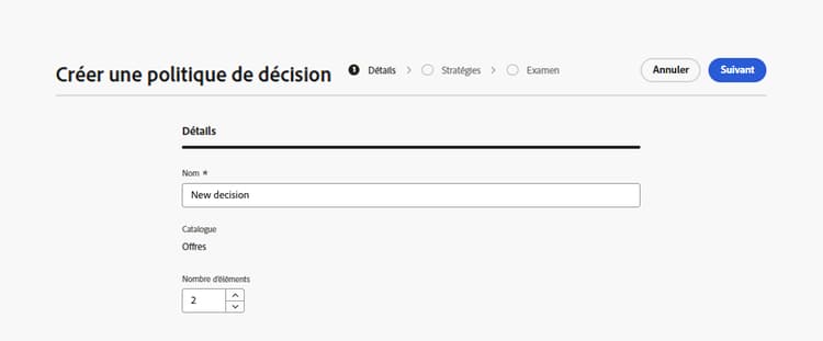 - Configurer la politique de décision : ajoutez un nom et indiquez le nombre d’éléments à renvoyer.