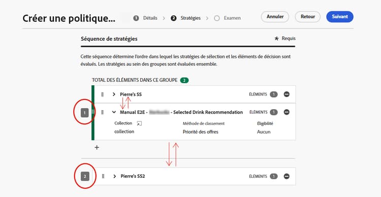 Lorsque vous ajoutez plusieurs éléments et/ou stratégies de décision, ils sont évalués dans un ordre spécifique. Le premier objet ajouté à la séquence sera évalué en premier, et ainsi de suite. Pour modifier la séquence par défaut, faites glisser et déposez les objets et/ou les groupes afin de les réorganiser selon vos besoins. Pour plus d’informations, développez la section ci-dessous.