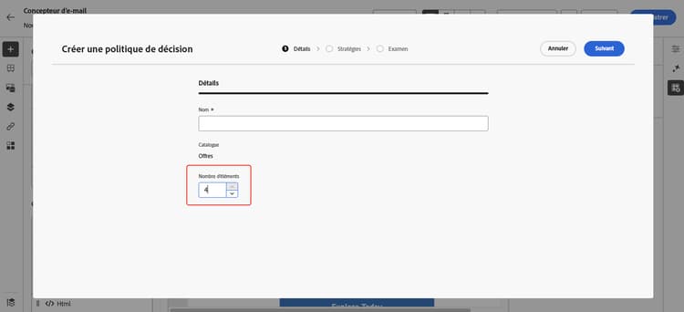 Pour le canal e-mail, le champ Nombre d’éléments est défini sur 1 par défaut et ne peut pas être modifié à moins que la politique de décision ne soit ajoutée à partir d’un composant Grille de répétition. Pour plus d’informations, développez la section ci-dessous :