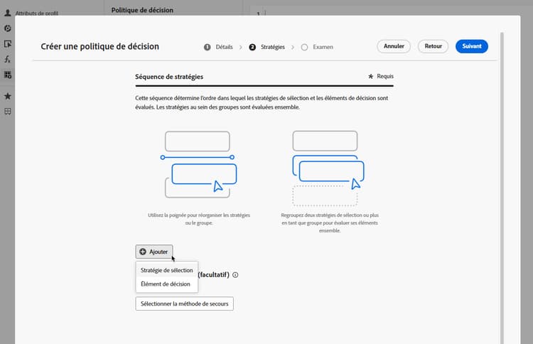note note NOTE Seules les stratégies de sélection peuvent être glissées-déposées dans une séquence. Pour modifier la position d’un élément de décision, vous devez le supprimer et l’ajouter à nouveau à l’aide du bouton Ajouter après avoir ajouté les autres éléments à évaluer auparavant. Vous pouvez également combiner plusieurs stratégies de sélection en groupes afin qu’elles soient évaluées ensemble et non séparément. Pour ce faire, cliquez sur le bouton