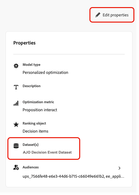 Propriétés - Cette section affiche les propriétés du modèle, telles que le jeu de données utilisé, la mesure d’optimisation et les audiences utilisées pour entraîner le modèle d’optimisation personnalisé.