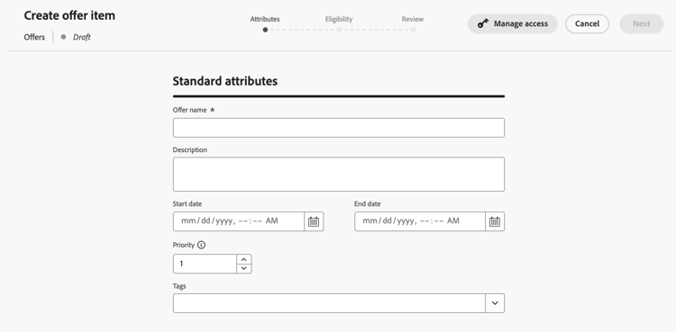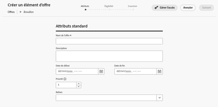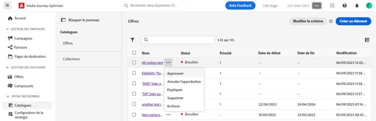 Journey Optimizer vous permet de créer des offres marketing, appelées éléments de décision, que vous pouvez créer et organiser dans un catalogue et des collections centralisés. Ils sont composés d’attributs standard et personnalisés, conçus précisément pour répondre à vos besoins. En outre, ils intègrent des contraintes de profil qui vous permettent de définir pour qui un élément de décision peut être affiché.