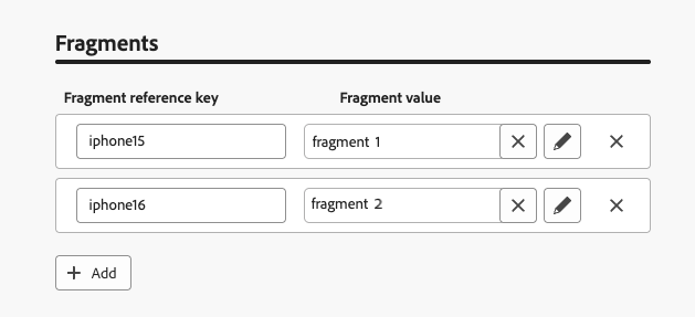 note availability AVAILABILITY Les fragments dans les éléments de décision ne sont actuellement disponibles que pour un ensemble d’organisations (disponibilité limitée). Pour plus d’informations, contactez votre représentant ou représentante Adobe. Dans la section Fragments, sélectionnez les fragments publiés que vous souhaitez utiliser et attribuez-leur une clé de référence. Vous pouvez ensuite utiliser ces fragments dans vos politiques de décision. Voici comment procéder