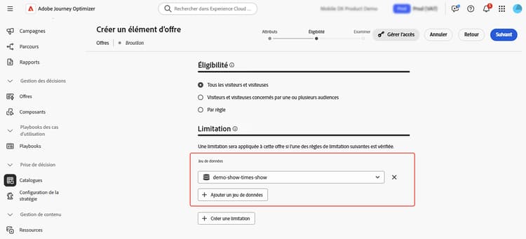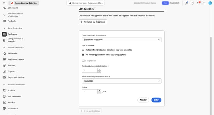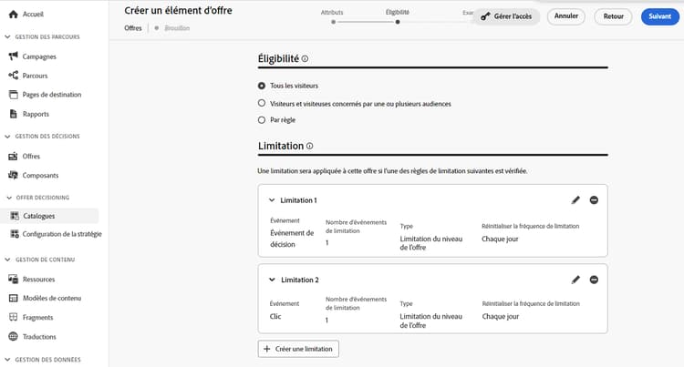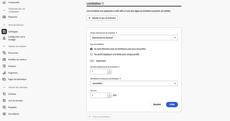 La limitation est utilisée comme contrainte pour définir le nombre maximal de fois où un élément d’offre peut être présenté. Limiter le nombre de fois où les personnes reçoivent des offres spécifiques vous permet d’éviter de sur-solliciter votre clientèle et donc d’optimiser chaque point de contact avec la meilleure offre. Vous pouvez créer jusqu’à 10 limitations pour un élément de décision donné.