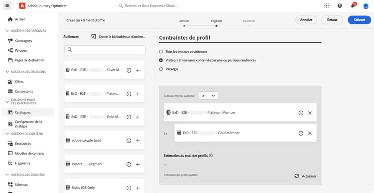 Audiences : d’un côté, les audiences sont un groupe de profils Adobe Experience Platform qui correspondent à une certaine logique basée sur les attributs de profil et les événements d’expérience. Cependant, la gestion des offres ne recalcule pas l’audience, qui peut ne pas être à jour lors de la présentation de l’offre.